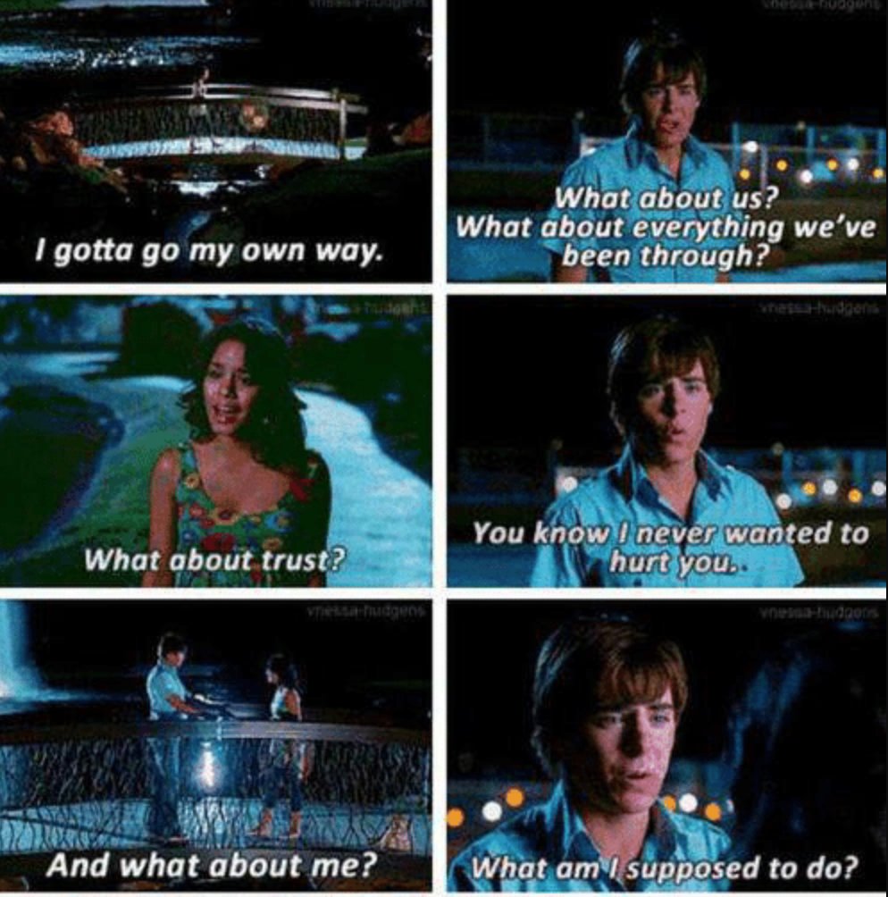 What About Us What About Everything Weve Been Through Gotta Go My Own Way Troy And Gabriella High School High School Musical High School Musical Meme On Me Me